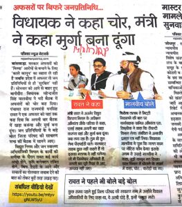 सियासत विधायक ने कहा चोर,मंत्री ने कहा मुर्गा बना दूंगा June 9, 2018 Gyanesh Kumar (दिनांक 14/11/2017 को पत्रिका में प्रकाशित खबर)