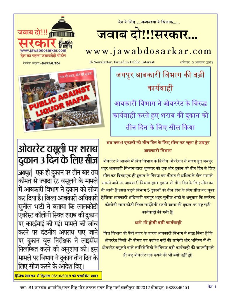 शराब माफिया के विरुद्ध आम जन आबकारी विभाग ने ओवररेट के विरुद्ध कार्यवाही करते हुए शराब की दूकान को तीन दिन के लिए सील किया October 5, 2019 Gyanesh Kumar