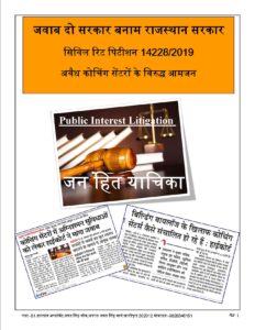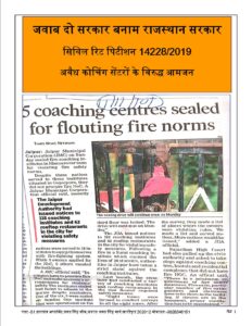 कोचिंग सेंटरों का मकडजालजन हित याचिका सरकारी जमीनों/आवासीय परिसरों में बिना नक़्शे अनुमोदित कराये,बिना फायर NOC के चल रहे कोचिंग संस्थानों के सम्बन्ध में August 23, 2019 Gyanesh Kumar राजस्थान उच्च न्यायालय ने स्वीकार की जन हित याचिका नगर निगम जयपुर ने सील किये बिना फायर अनुमति चल रहे 5 कोचिंग संस्थान