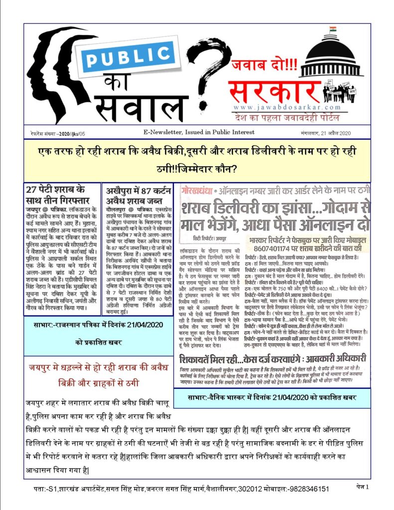 जनता का सवालशराब माफिया के विरुद्ध आम जन एक तरफ हो रही शराब कि अवैध बिक्री,दूसरी और शराब डिलीवरी के नाम पर हो रही ठगी!!जिम्मेदार कौन? April 21, 2020 Gyanesh Kumar